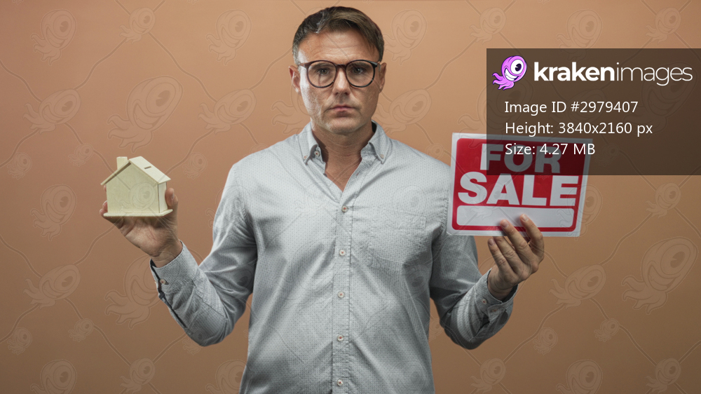 Man wearing glasses holds a miniature house and red for sale sign in studio, holding both objects up and facing forward; uncertainty decision doubt.