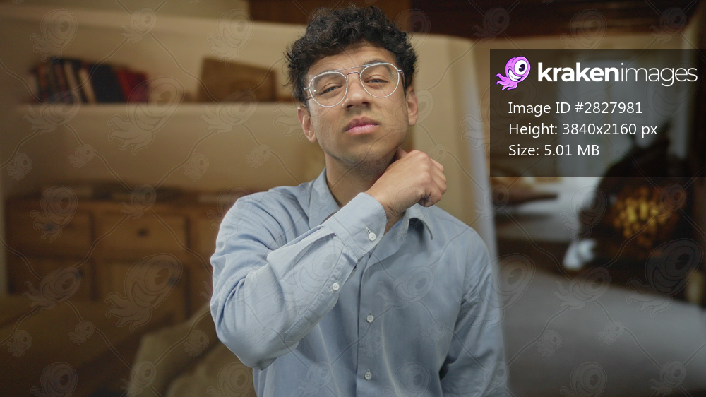 Man wearing glasses holds fist to chest in building interior with warm light and blurred furnishings; determination.