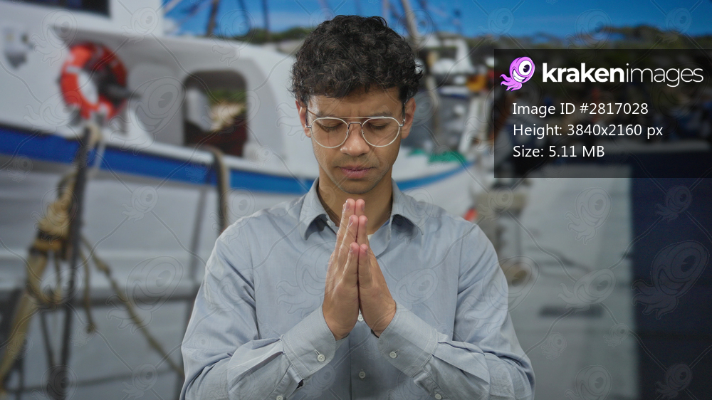Man wearing glasses holds hands together in prayer at a marina port beside a white and blue boat; devotion faith peace serenity.