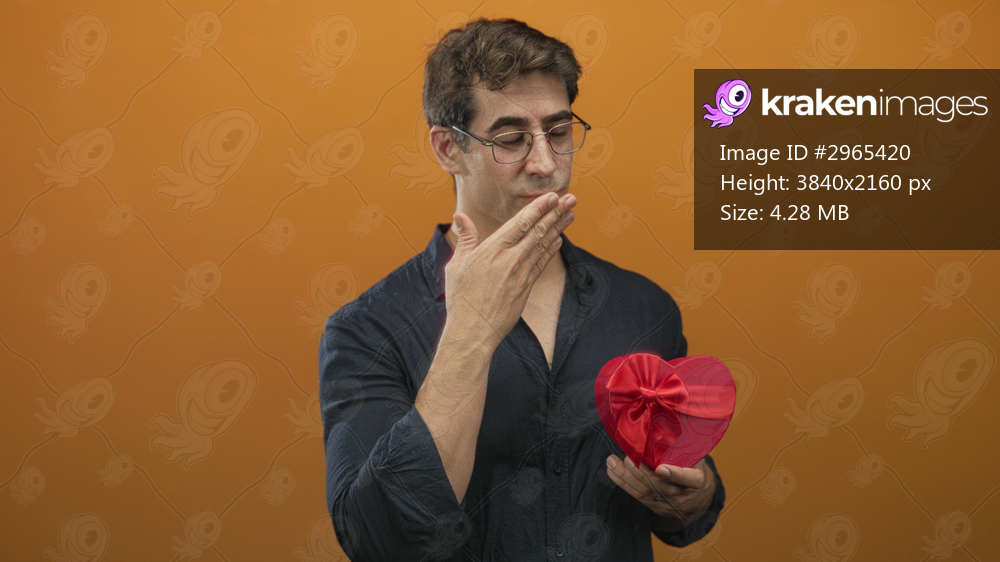 Man wearing glasses holds red heart gift and blows a kiss while smiling in a studio with orange backdrop; romantic love.