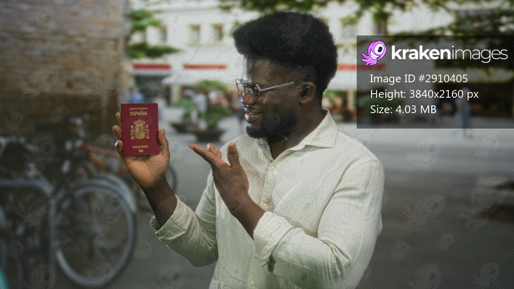 Man wearing glasses holds spanish passport in his right hand and points finger to passport while smiling on a city street with bicycles; travel pride.