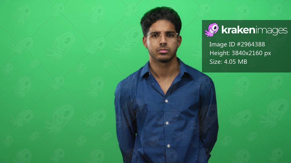 Man wearing glasses in blue shirt standing with hands behind back and eyes closed in green screen studio; introspection.