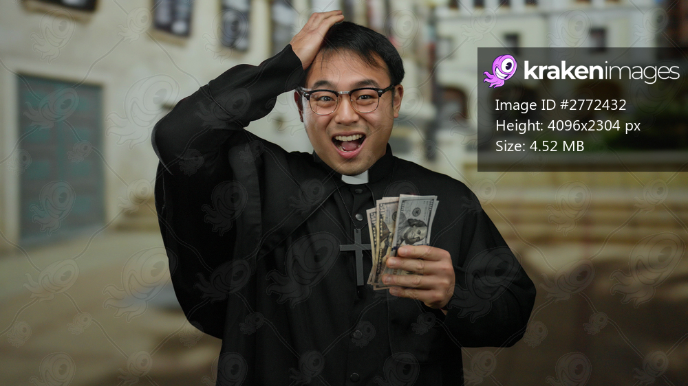 Man wearing glasses in priest attire holding us dollar bills in an urban outdoor setting with an excited expression on a city street.