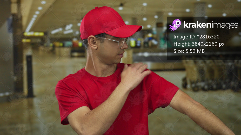 Man wearing glasses in red shirt touches shoulder while pulling sleeve in airport terminal; anticipation.