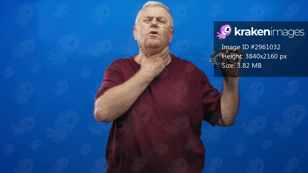 Man wearing glasses and maroon shirt holds phoropter and touches throat for sore throat during vision exam in studio; discomfort health concern.