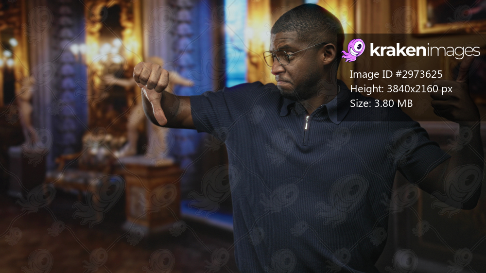 Man wearing glasses and navy polo showing thumbs up and thumbs down with both hands in an ornate museum interior while smiling broadly; playful ambivalence. - Kraken Images