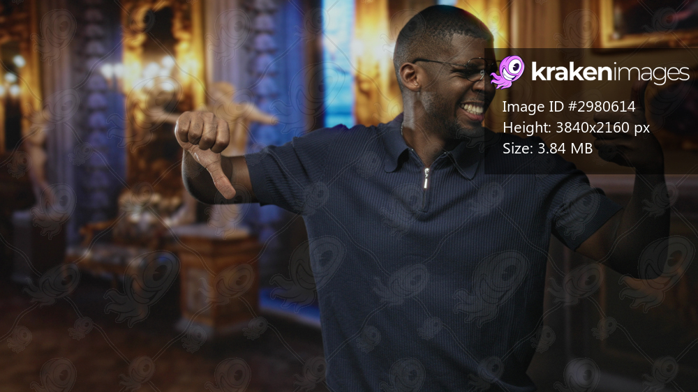 Man wearing glasses and navy polo showing thumbs up and thumbs down with both hands in an ornate museum interior while smiling broadly; playful ambivalence. - Kraken Images