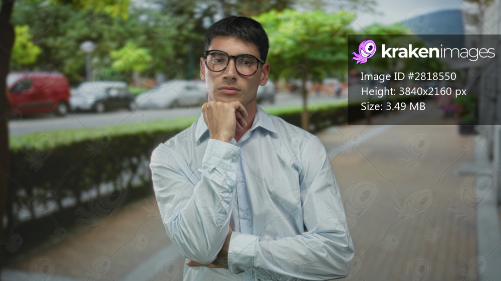 Man wearing glasses and pale dress shirt resting his hand on chin on urban street lined with trees; reflection.