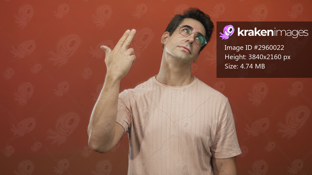 Man wearing glasses and peach t shirt points two fingers to temple with visible hand and tilted head, looking down against red studio wall; frustration. - Kraken Images
