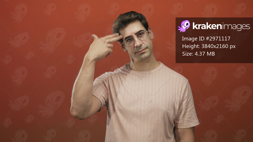 Man wearing glasses and peach t shirt points two fingers to temple with visible hand and tilted head, looking down against red studio wall; frustration. - Kraken Images