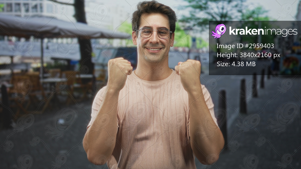 Man wearing glasses and pink t shirt with clenched fists raised at chest, smiling and looking upward in street cafe beside bollards and outdoor tables; triumph. - Kraken Images