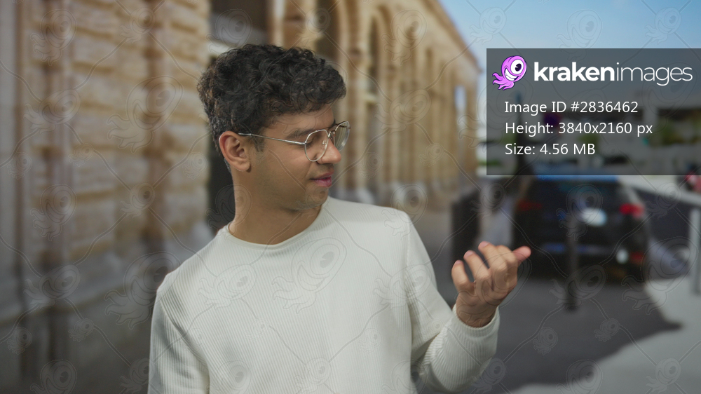 Man wearing glasses playing air guitar with bare hands on a sunny historic city street; joy leisure.