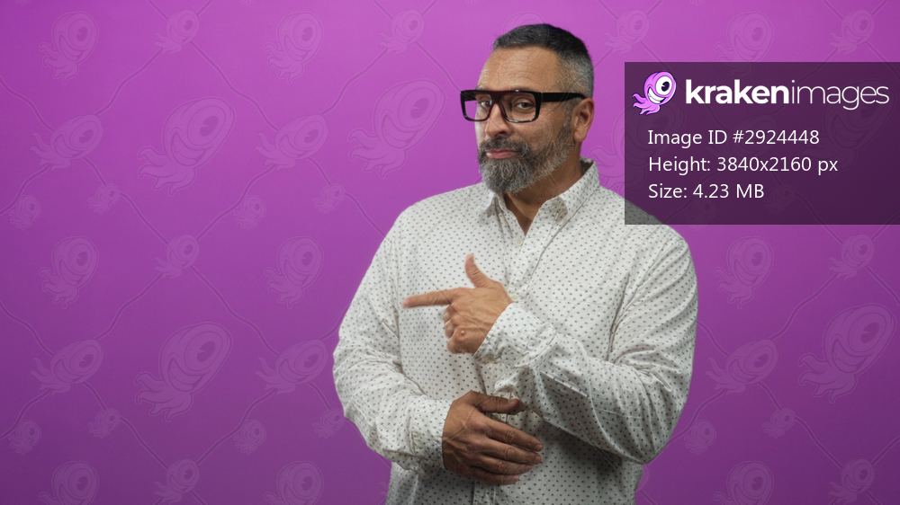 Man wearing glasses pointing finger with clasped hands in purple studio set; confidence witty charm.