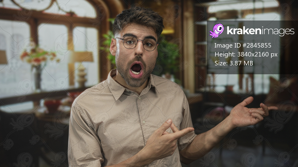 Man wearing glasses pointing finger inside hotel building amid wooden windows and flower vase; explanation.