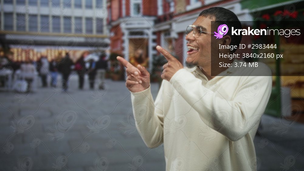 Man wearing glasses points both index fingers to the left while smiling on a crowded city street with storefronts and holiday stalls; playful joy.