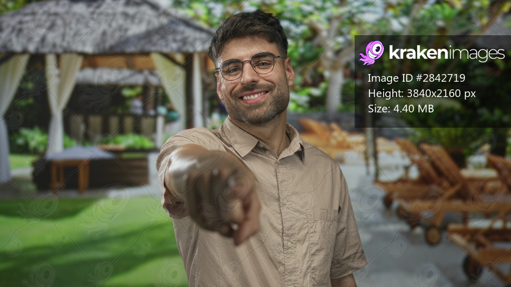 Man wearing glasses points his finger forward across green forest clearing beside park bench; confidence.