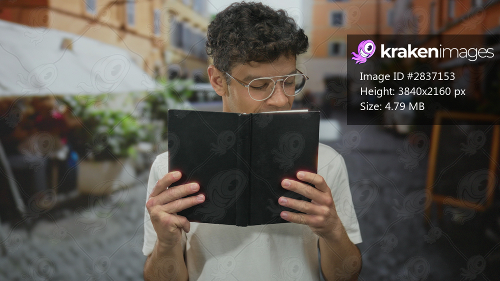 Man wearing glasses reading book on street terrace under sunlight while seated at a cafe table; serene contentment.