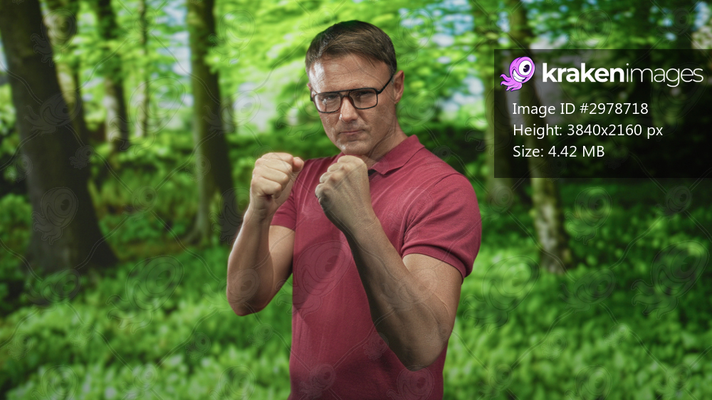 Man wearing glasses and red polo with fists raised in fighting stance in forest clearing, centered; determination focus resilience.