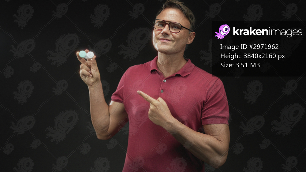 Man wearing glasses and red polo, holding a contact lens case between thumb and forefinger and points finger at it in studio; eye care confidence.