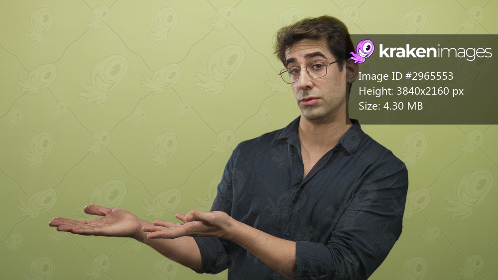 Man wearing glasses shows palms up gesture and open hands in studio while tilting his head and shrugging shoulders; uncertainty doubt.