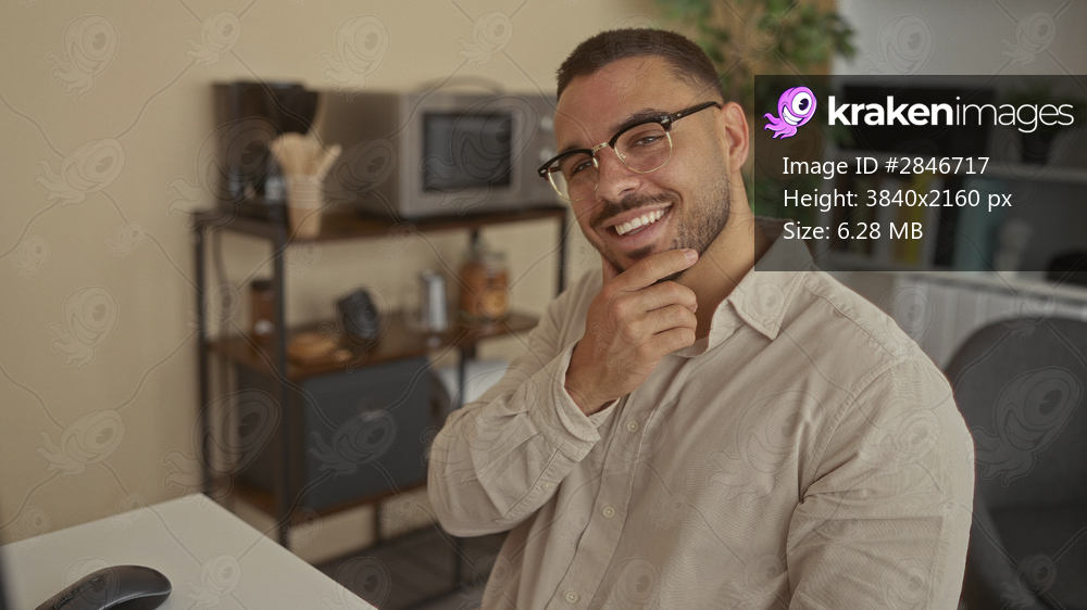 Man wearing glasses sits at white desk and smiles with hand on chin in office; confidence and creativity.