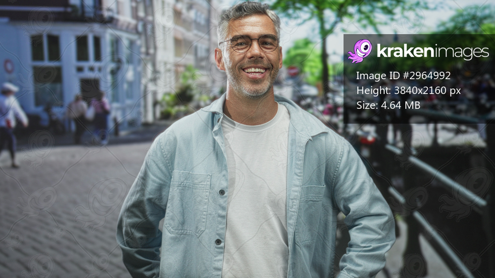 Man wearing glasses smiling with hands in pockets on a busy city street, light denim overshirt over white tee visible; calm confidence.