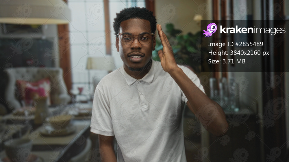 Man wearing glasses smiling and making flat hand gesture under a lamp in a building living room; calm.