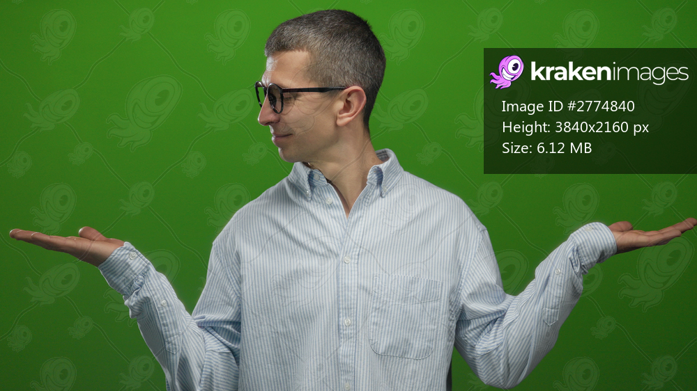 Man wearing glasses standing against a green background wall, looking sideways with hands open in a questioning gesture, wearing a striped shirt, implying a choice or decision. - Kraken Images