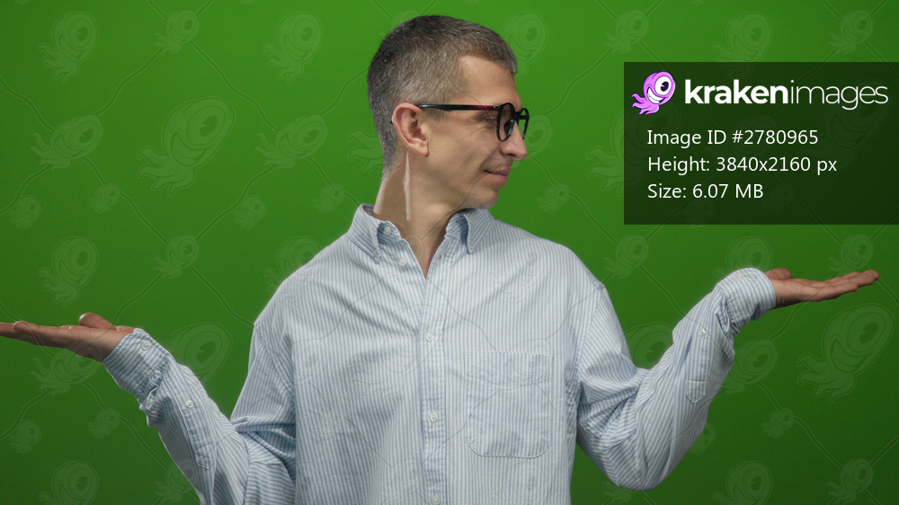 Man wearing glasses standing against a green background wall, looking sideways with hands open in a questioning gesture, wearing a striped shirt, implying a choice or decision. - Kraken Images