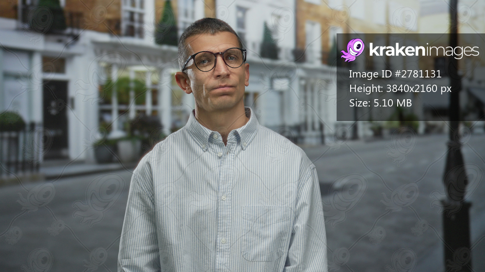 Man wearing glasses standing on a quiet street outdoors, embodying urban lifestyle with classic architecture as a backdrop.