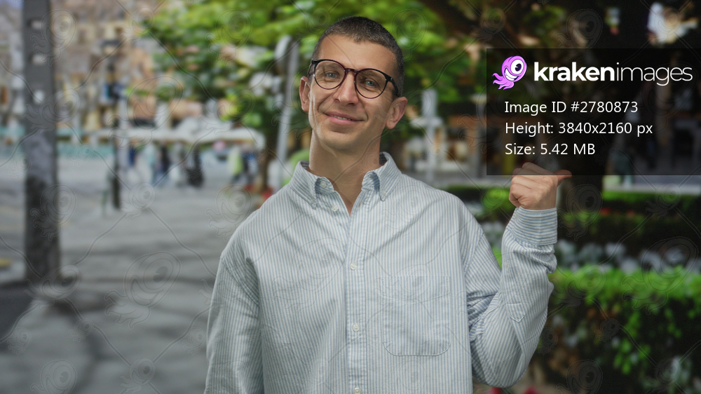 Man wearing glasses standing on an outdoor street, casually pointing with a smile, showcasing a casual urban lifestyle amidst a vibrant cityscape in the background. - Kraken Images