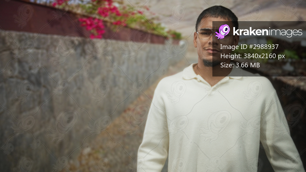 Man wearing glasses stands with hands at sides on a stone street beside a planter and wall, looking slightly to the right; contemplation.