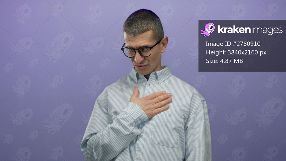 Man wearing glasses and striped shirt poses with hand on chest against isolated purple background, conveying surprise or realization.