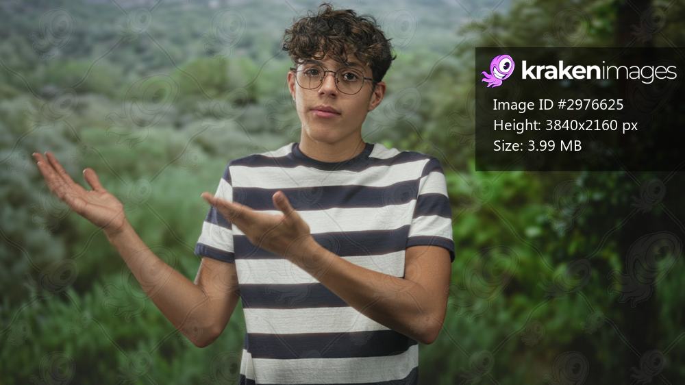 Man wearing glasses and striped tshirt gesturing with open hands and palms up while explaining in a forest setting; questioning curiosity.