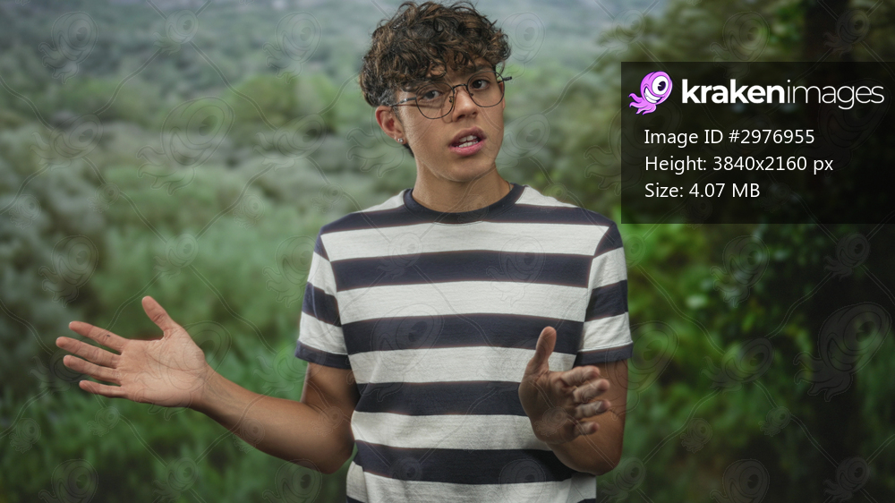 Man wearing glasses and striped tshirt gesturing with open hands and palms up while explaining in a forest setting; questioning curiosity.