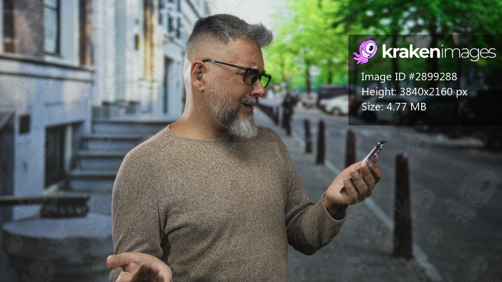 Man wearing glasses and sweater holding smartphone with finger pointing to screen on city street, shrugging with other hand; digital confusion.