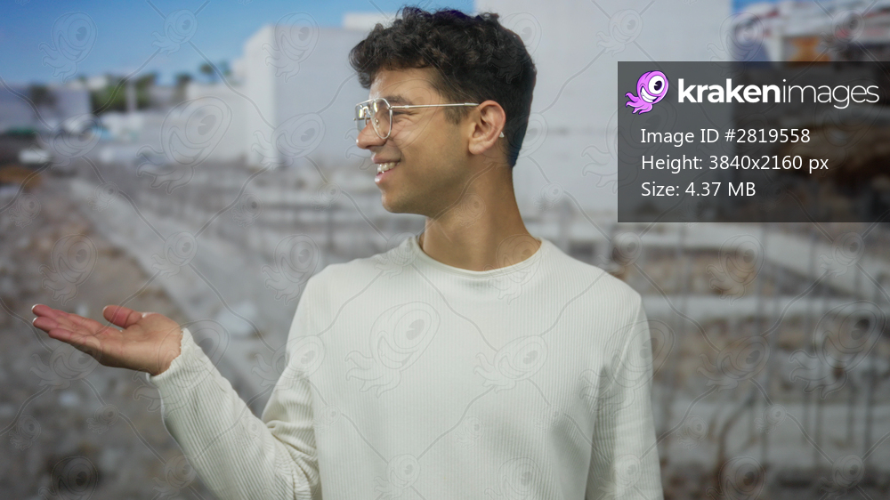 Man wearing glasses and sweater smiles with palm up at building frame beneath sunny sky in morning light; optimism.