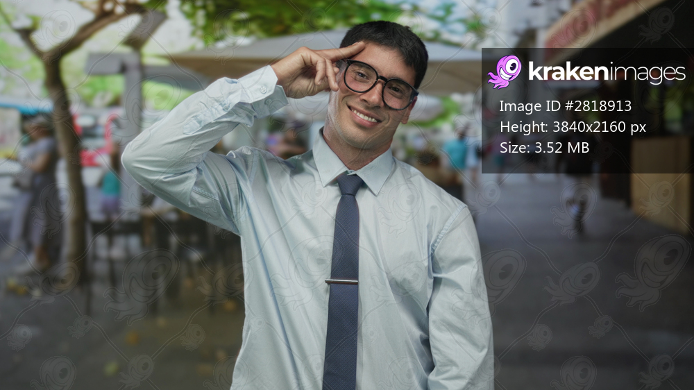 Man wearing glasses and tie points finger at camera beside sunlit cafe table on street; joyful invitation.