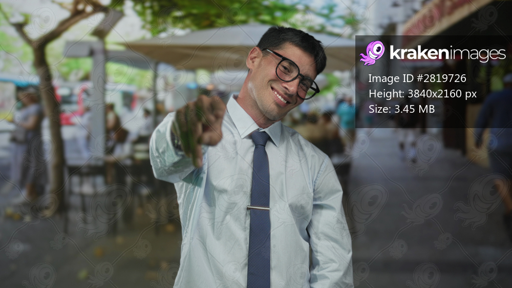 Man wearing glasses and tie points finger at camera beside sunlit cafe table on street; joyful invitation.