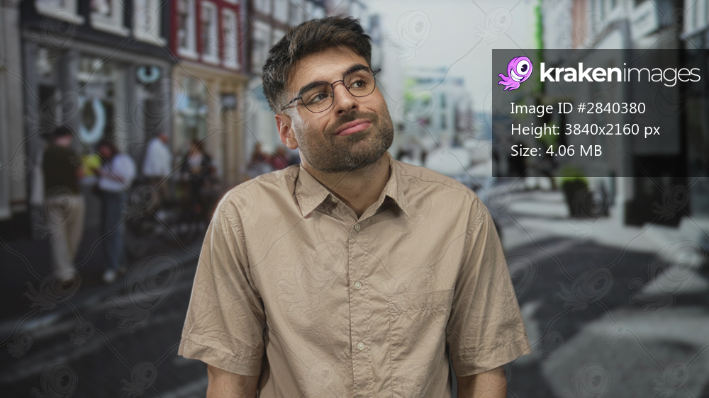 Man wearing glasses tilts head slightly with closed eyes in a busy city street lined with brick storefronts and blurred pedestrians; indifference.