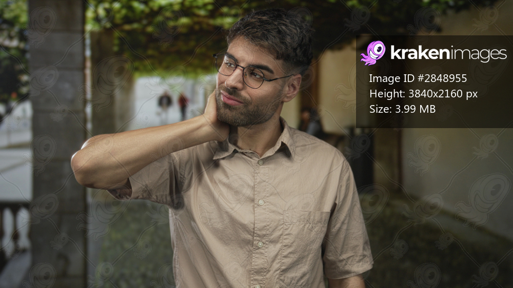 Man wearing glasses touches neck on street under leafy canopy and next to stone building facade; doubt.