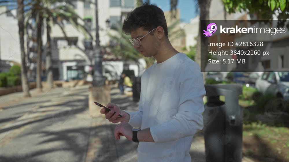 Man wearing glasses using smartphone and tapping watch on wrist in a sunlit green park beside palm trees; mindfulness reflection introspection focus.