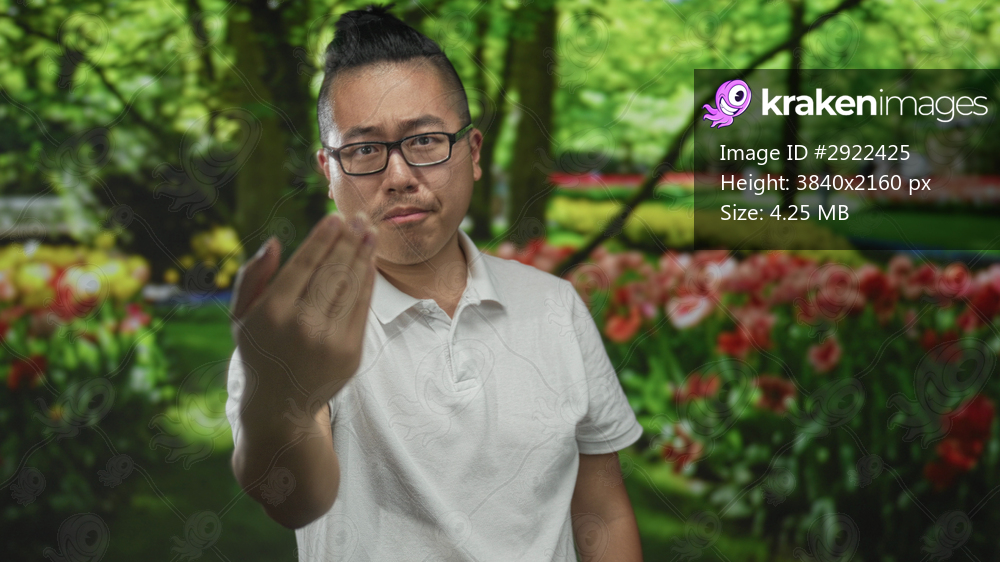 Man wearing glasses and white polo beckons with hand and points finger toward camera in forest setting; urgent demand.