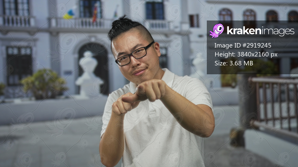 Man wearing glasses and white polo, finger pointing to camera in front of building on a street, pointing finger extended; direct confidence.