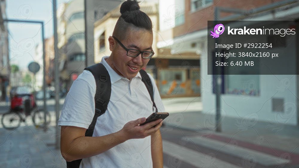 Man wearing glasses and white polo holding smartphone with visible hand and backpack on urban street beside storefront and bicycle rack, checking screen and glancing up; curiosity travel planning. - Kraken Images