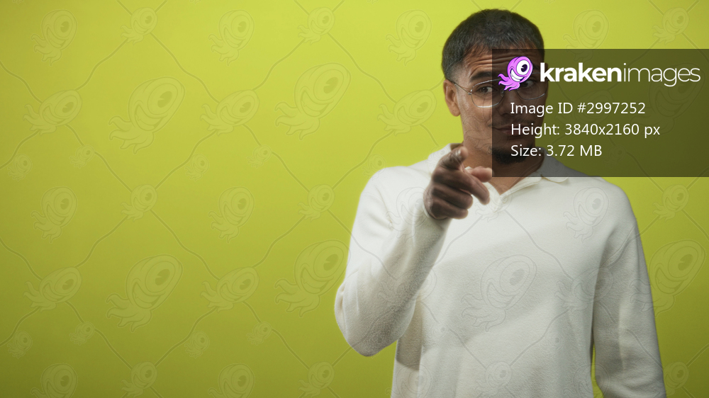Man wearing glasses and white polo shirt points finger with blurred hand in studio against bright green wall; confidence engagement.
