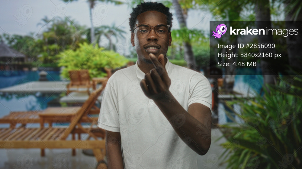 Man wearing glasses and white polo shirt shows finger heart gesture by pool at resort building under palm trees; affection.