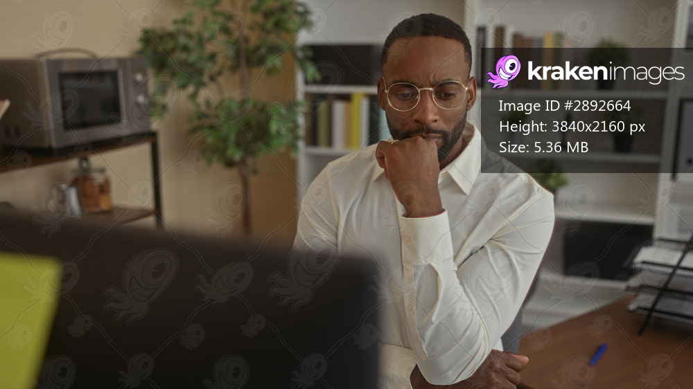 Man wearing glasses and white shirt with hand on chin at office desk viewing computer screen; concentration productivity.