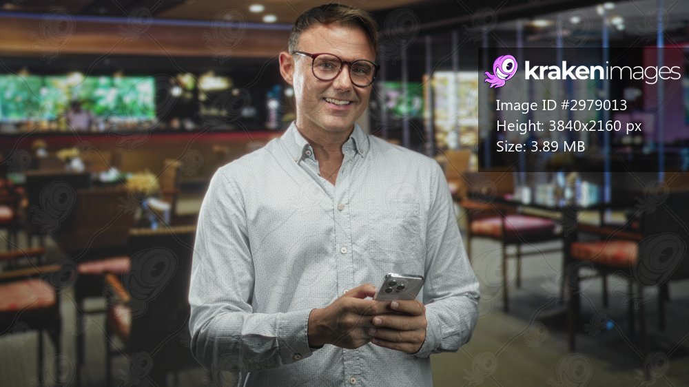 Man wearing glasses and white shirt holding smartphone, smiling and typing with hands in a building lounge with chairs and bar visible; confidence.