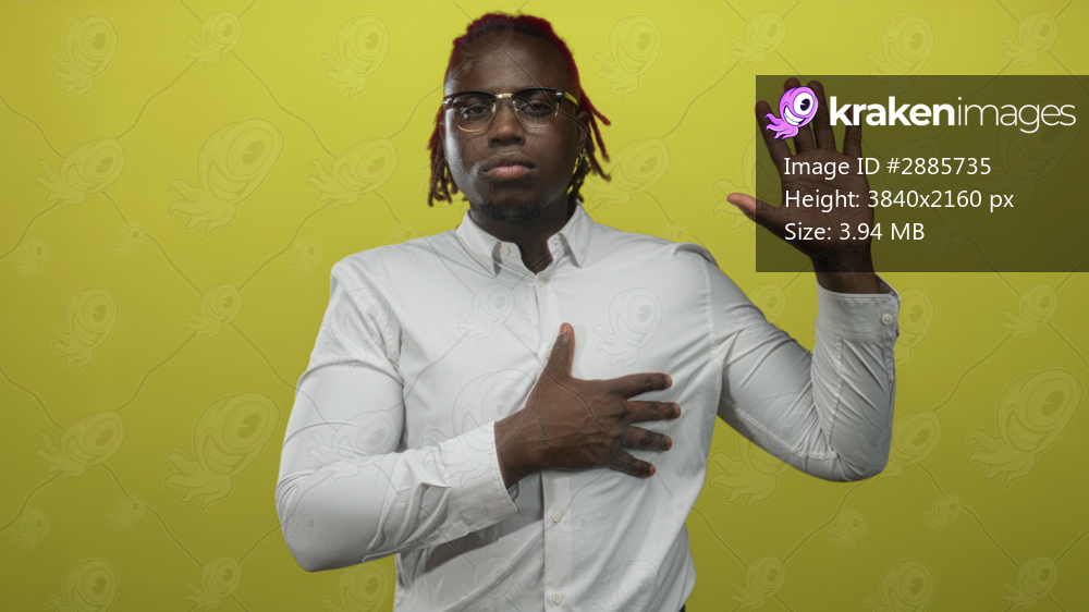 Man wearing glasses and white shirt with one hand on chest and raised palm facing forward in a bright yellow studio; pledge sincerity.
